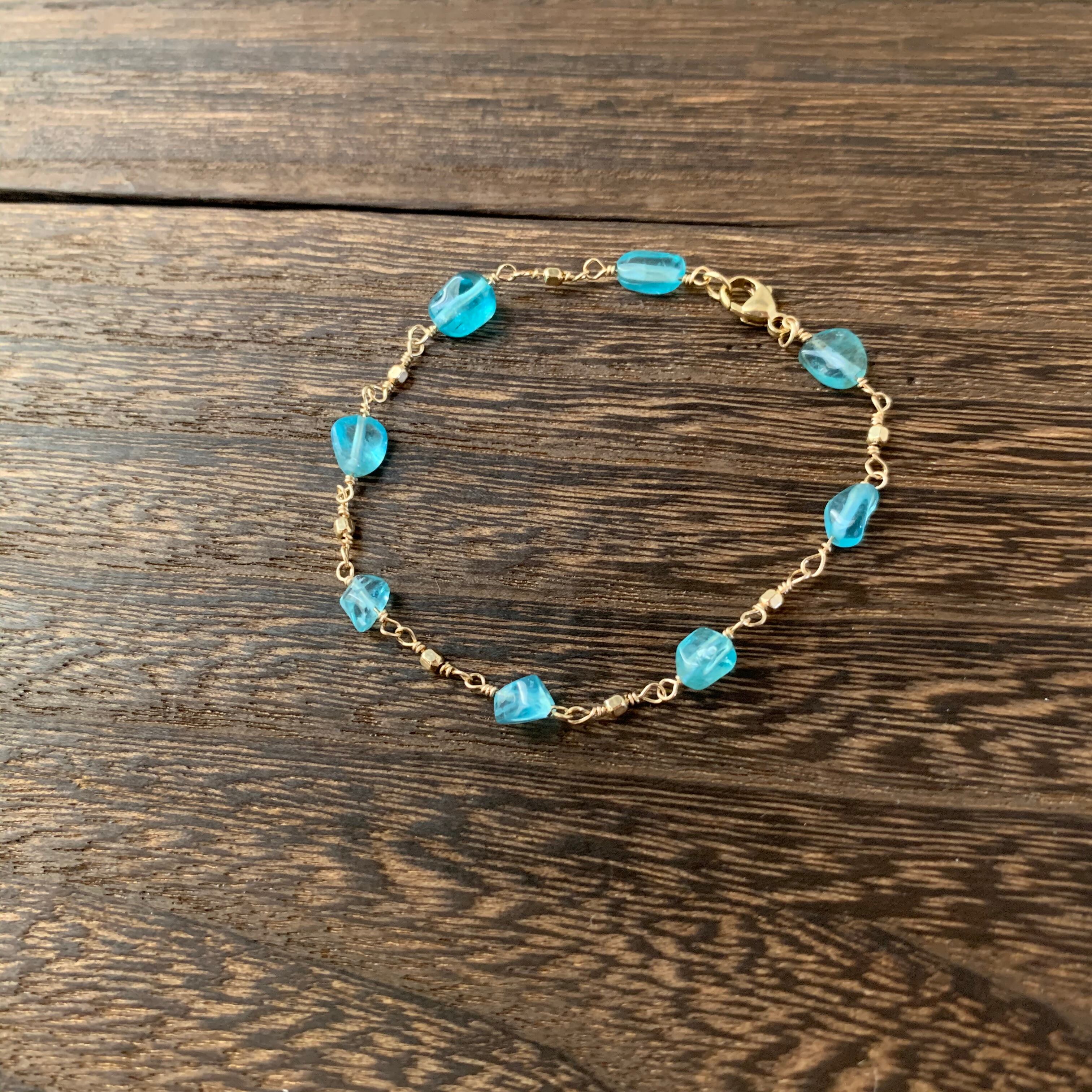 一粒づつ大きさや形の違うアパタイト。同じ作品のない一点もののブレスレットです。ワイヤーで一粒づつ丁寧に繋ぎ合わせました。