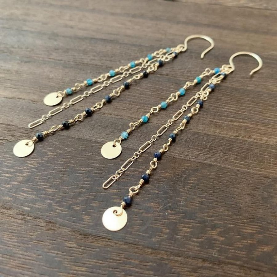 小さなサファイアとアパタイトにゴールドチェーンを合わせフリンジピアスにしました。